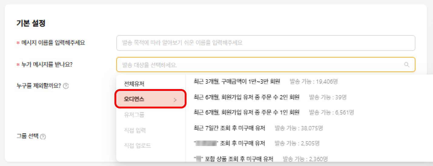 메시지 작성 화면 -> 기본 설정 > 발송 대상 -> `오디언스` -> 오디언스 선택