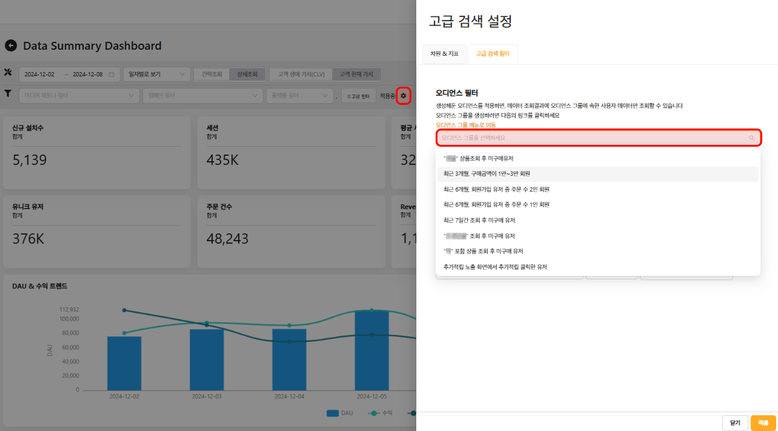 대시보드 `상세조회` 설정 -> ⚙️-> 고급 검색 필터 > 오디언스 필터 -> 오디언스 선택 후 적용