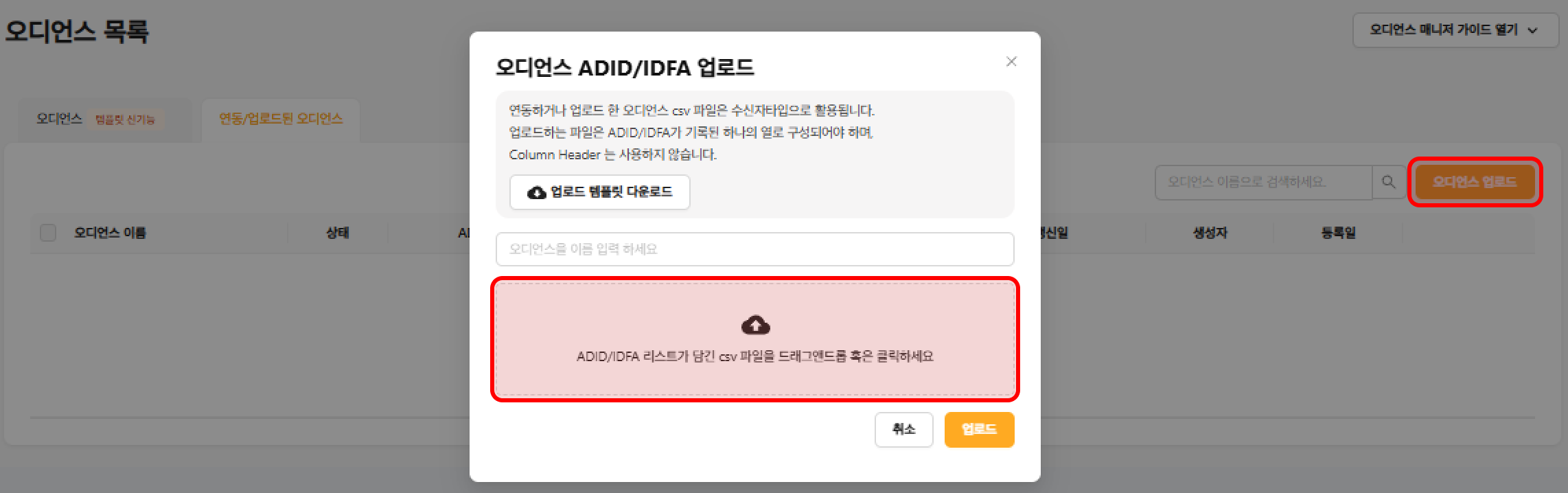 ### <mark style="color:blue;">**4️⃣ 오디언스 파일 업로드**</mark>