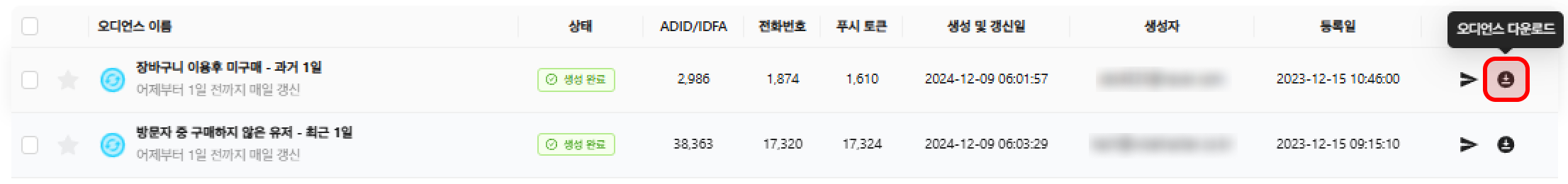생성된 오디언스 파일을 다운로드 받아 ADID/IDFA 를 추출할 수 있습니다.