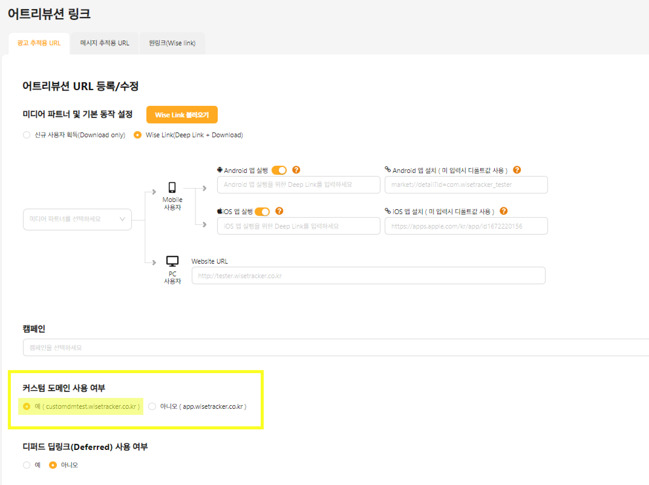 와이즈트래커에서 제공하는 어트리뷰션 링크를 자사의 브랜드 도메인를 이용하여 생성할 수 있습니다.