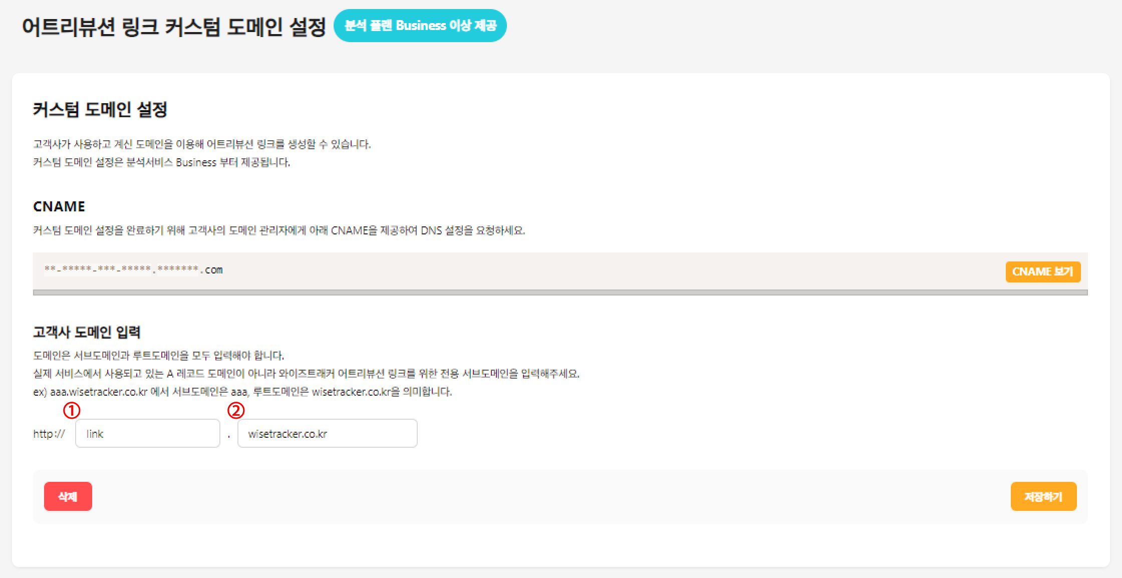 * 커스텀 도메인은 분석서비스 **Business 플랜 이상** 고객사에 한해 **1개만** 추가하실 수 있습니다.